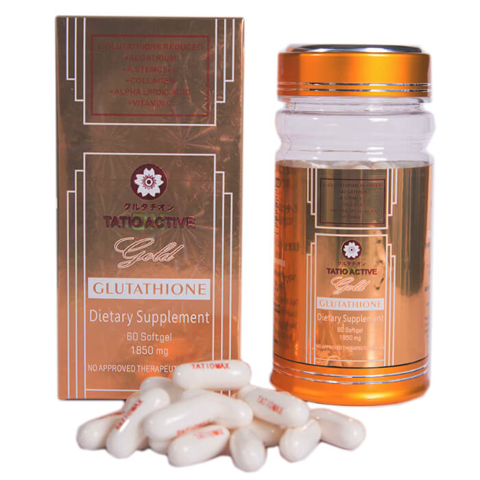 - Viên uống trắng da Tatio Active Gold Glutathione 1850mg Nhật Bản 60 viên với thành phần chính là Glutathione mang lại tác dụng rất hiệu quả trong việc ngăn chặn hoạt động sản xuất ra melanin, góp phần làm giảm nồng độ sắc tố da, từ đó sẽ mang lại cho bạn làn da trắng sáng, mềm mịn từ bên trong.